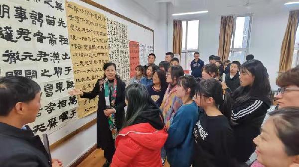 讲座结束后,石主席走进书法专业教室,与员工们近距离交流,对同学们的书法作品进行点评与指导,为同学们答疑解惑。员工们学习热情空前高涨,现场气氛十分热烈。