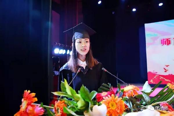 学前教育专业杨楠同学代表毕业生发言,她表达了对于母校的感激之情,对老师付出的感恩以及对于一直陪伴的家人、同学的感谢,她回忆了这大学四年的点点滴滴,无不透露出对于即将毕业、离开母校的不舍。同时她也表示会用自己的成绩来回报母校的培育,为母校增添荣光。