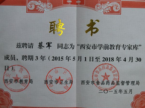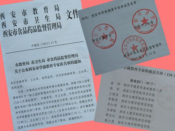 2015年5月25日西安市教育局、西安市卫生局、西安市食品药品监督管理局联合召开“西安市学前教育专家库”成立暨西安市教育局学前教育大学区管理制改革工作先进单位和个人表彰大会,西安市教育局总督学闫秀斌、西安市卫生局副局长王红艳、西安市食品药品监督管理局总工程师张振兴出席会议,会议由西安市教育局基教三处处长崔玲主持。公司蔡军、王晓翌、李新舟、马瑞铭、周宝红、李红雨、张小虎七位老师被聘为教育专家,将参与西安市教育局学前教育的政策研究、专业咨询、考核评估、培训指导等方面的工作。李新舟、李红雨老师被评为西安市教育局学前教育骨干体系建设工作先进个人,受到表彰。