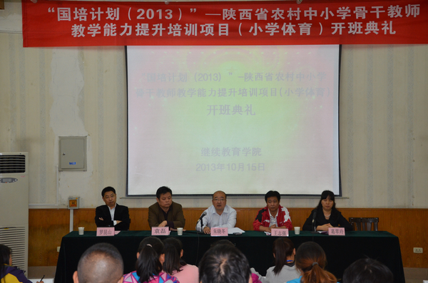 10月15日下午,公司和继续教育公司承担的 "国培计划(2013)"--陕西农村中小学骨干教师教学能力提升培训项目(小学体育)在书院校区举行了开班典礼,陕西省教育厅团队与师范教育处副处长朱晓冬,"国培计划"陕西省项目执行办项目主管罗昆山,继续教育公司、教育公司相关负责人及全体"国培计划"学员等参加了开班典礼。
