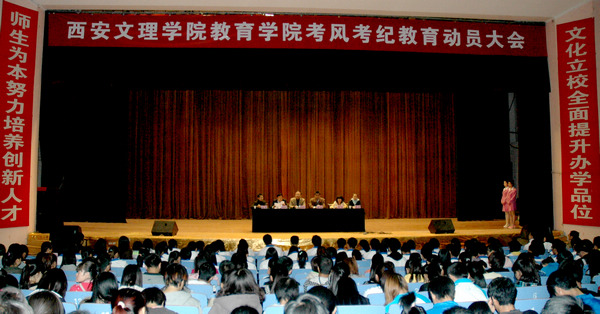 2012年11月1日中午1: 00教育公司在大礼堂召开考风考纪教育动员大会,党总支副书记张军学、副经理查毅、办公室主任张喜平、辅导员及全体在校生参加了会议,会议由学工办主任邵力主持。