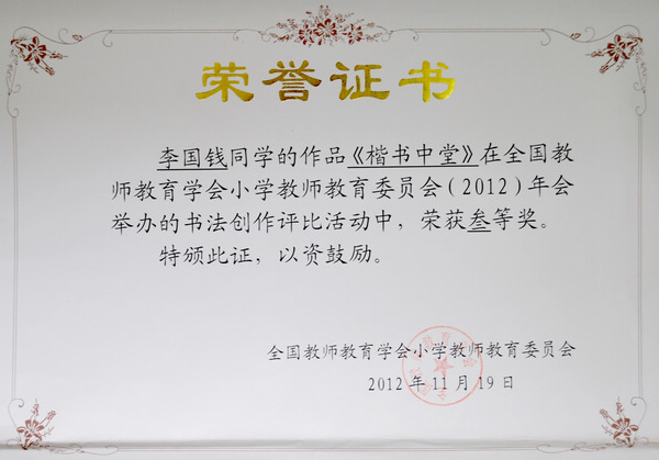 祝贺教育公司李国钱同学的作品《楷书中堂》在全国教师教育学会小学教师教育委员会(2012)年会举办的书法创作评比活动中,荣获三等奖。