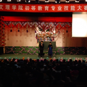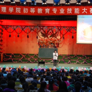 参加此次大赛决赛的是从复赛中脱颖而出的杨欣、龙瑾、蔡青、唐宁、张洁等10人,此次比赛共分两轮: 第一轮是讲成语故事,选手根据抽到的题目现场讲解;第二轮是模拟课堂环节。整个比赛进行的紧张有序,台上选手们表演的非常精彩,台下听得认真,还不时的发出阵阵掌声。经过紧张激烈的角逐,最后龙瑾获得一等奖、二等奖由杨欣、张洁荣获、三等奖由尚礼、刘瑞和蔡青获得。
