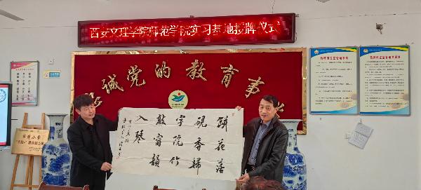 最后,马伟向三所小学授牌并与对方签订实习基地协议,向三所小学赠送书法作品。