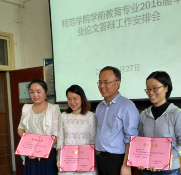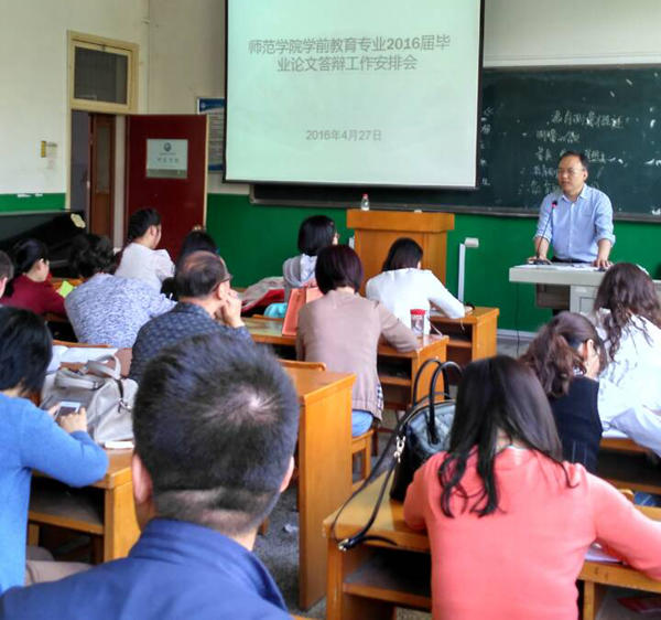 2016年4月27日下午4:00beats365唯一官方网站幼儿师范系在弘文楼H0301隆重召开了2016届学前教育本科毕业生论文答辩工作安排会,公司党委书记张军学,幼儿师范系主任王晓翌、系主任助理赵四鸿、各教研室主任及48位答辩委员,幼儿园外聘骨干教师代表参加会议。系主任王晓翌主持会议,党委书记张军学为幼儿园外聘教师颁发了聘书及优秀教师指导证书,张书记针对答辩的意义和以毕业论文为载体,多方面引导和指导员工如何挖掘自身潜力把论文的理论知识变为社会应用价值高的知识等方面发表了讲话,对在做教师提出了希望和要求,老师们表示一定做好论文的收尾工作,保证答辩顺利进行,完满完成任务。