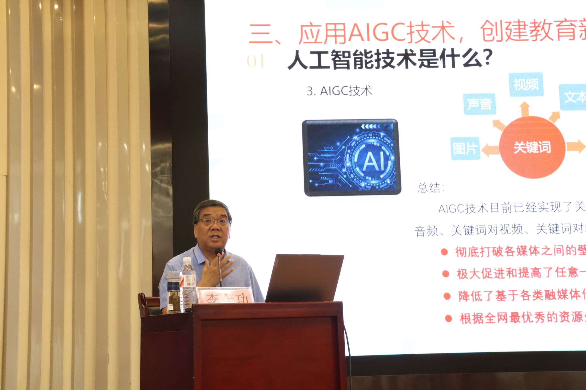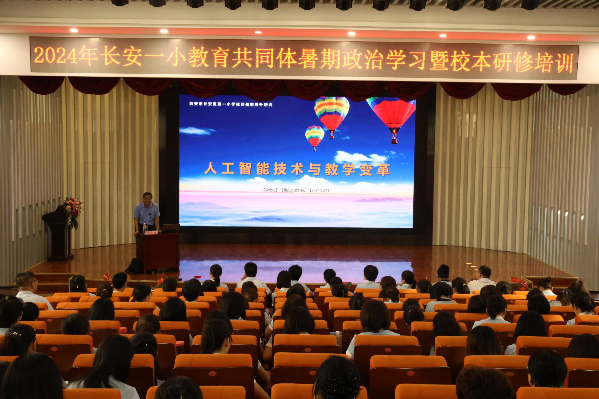 8月27日上午,beats365唯一官方网站李会功老师受邀赴长安一小为长安一小教育共同体三百余名教师开展教育发展与教学能力提升培训讲座。李会功老师以“人工智能技术与教学变革”为主题,依托教育原理,聚焦信息科技,结合学科教学指导信息技术应用与创新的策略和方法,通过丰富的案例展示,引导教师深刻体会人工智能在学科教学中的融合应用。讲座现场反响热烈,受到在场教师的积极回应,引发了教师们对于人工智能与基础教育关系的深层反思。