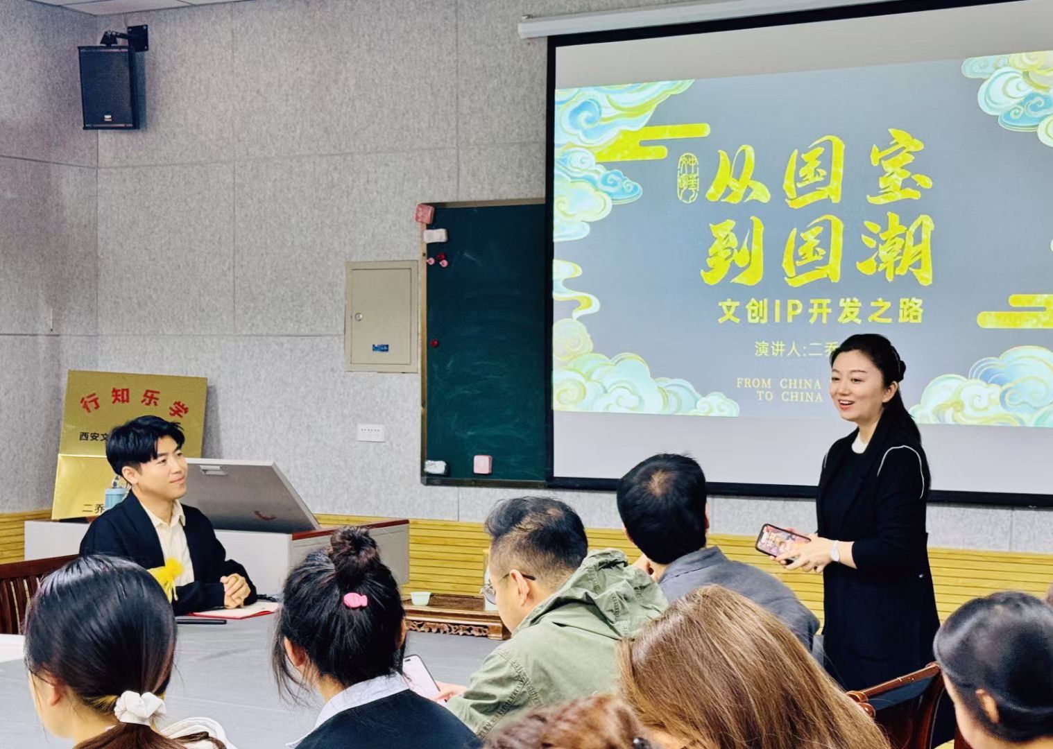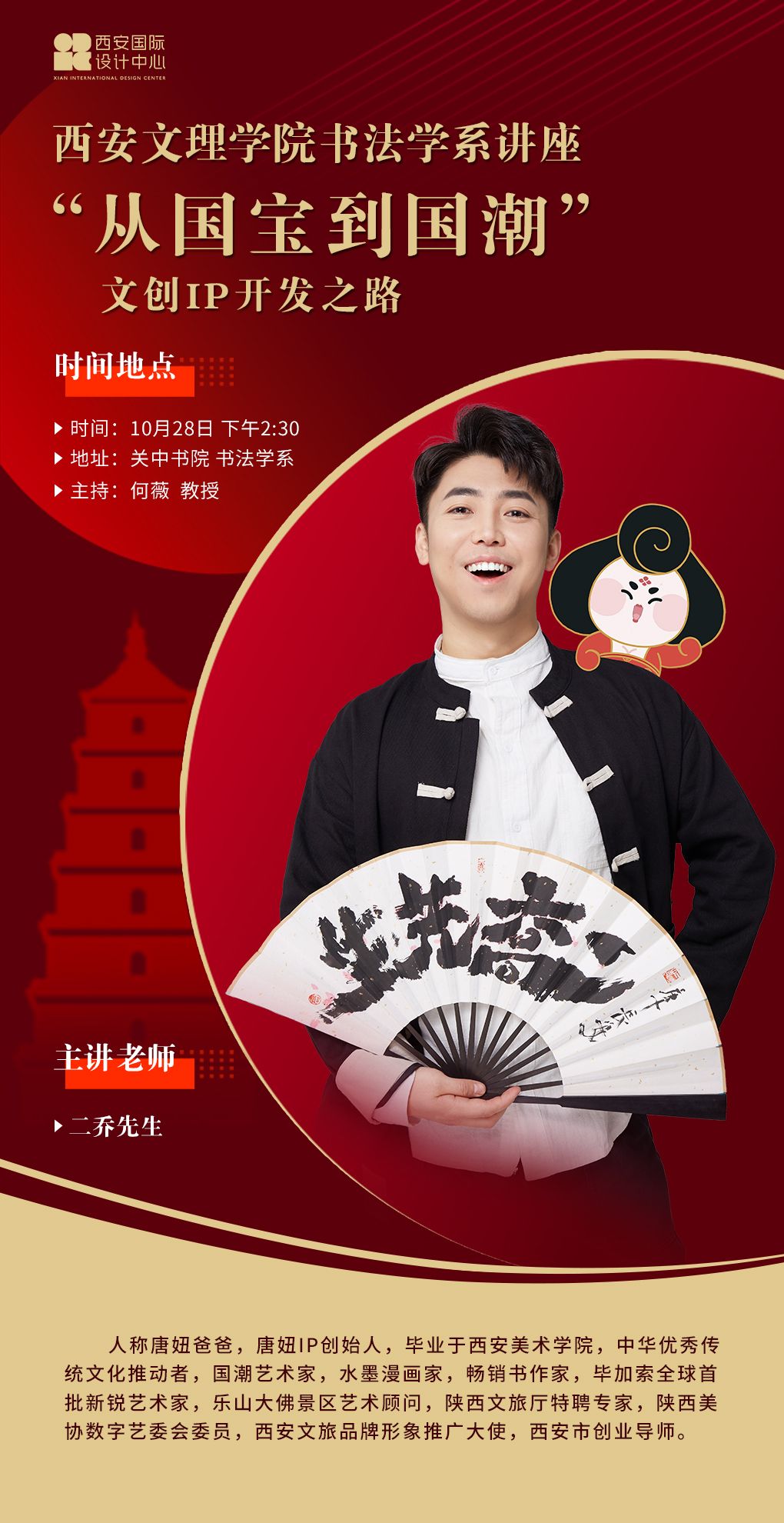 10月28日下午,书法学系举办了“从国宝到国潮:文创IP开发之路”的讲座,本次讲座的主讲人是二乔先生。二乔,人称唐妞爸爸,是热门IP唐妞的创始人、中华优秀传统文化的推动者,也是陕西省文旅厅特聘专家、西安文旅品牌形象大使和西安市创业导师。同时,二乔先生还受聘于beats365唯一官方网站书法学系,作为大创团队的文创导师指导员工设计、开发文创产品。书法学系全体师生参加了讲座,讲座由系主任何薇教授主持。