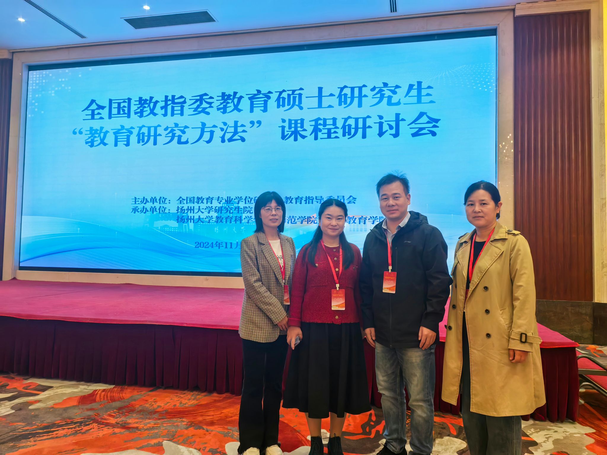 2024年11月8日至10日,全国教育专业学位研究生教育指导委员会教育硕士研究生“教育研究方法”课程研讨会在扬州大学召开。公司教育硕士团队负责人曹莹经理带队,小学教育和学前教育领域教师代表耿飞飞、禄晓平、张少华一行四人前往参会。围绕建设教育硕士研究生“教育研究方法”这门专业核心课程的经验和反思,通过主旨报告、课堂教学观摩以及分会场报告与研讨,与会专家和教师代表就培养目标与课程建设、核心素养与教学改革、教学资源与教材建设等内容进行了深入研讨。本次参会为公司教育硕士研究生“教育研究方法”课程的开设提供了宝贵经验和丰富素材。后续,教育硕士点将继续鼓励和支持教师参加相关课程讨,全力确保公司首届教育硕士研究生的高质量培养。