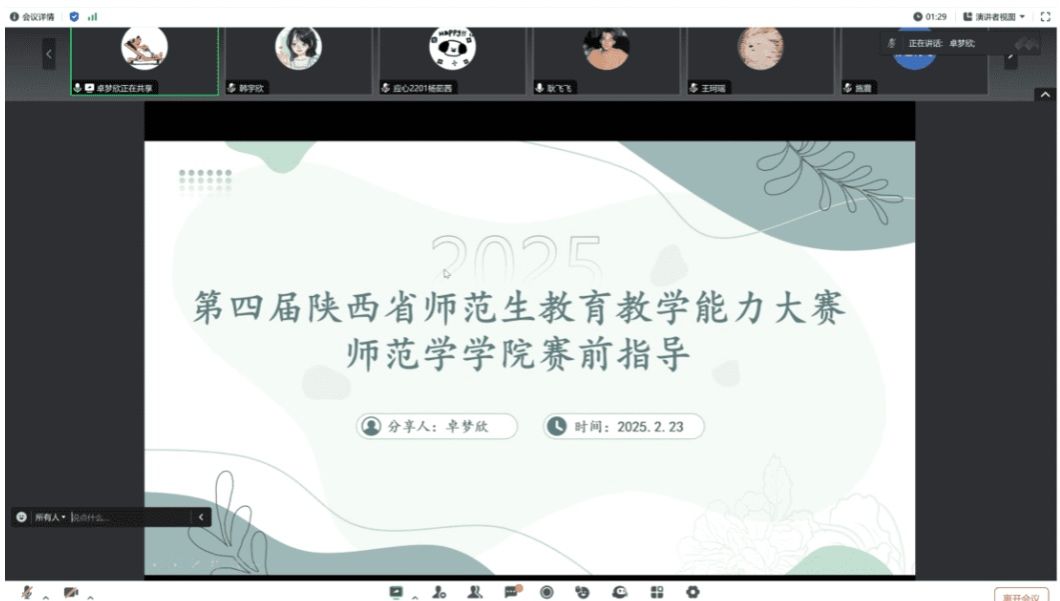 2025年2月23日,beats365唯一官方网站为备战第四届陕西高等公司师范生公司产品能力大赛决赛,特邀请第二届大赛特等奖获得者卓梦欣老师为参赛选手进行了一场精彩的经验交流与分享会。此次会议小学教育、应用心理学、书法学三个专业比赛指导教师和参赛选手共同出席,小学教育教研室主任耿飞飞担任主持,五位决赛参赛选手积极参与,共同为即将到来的大赛做最后的冲刺准备。