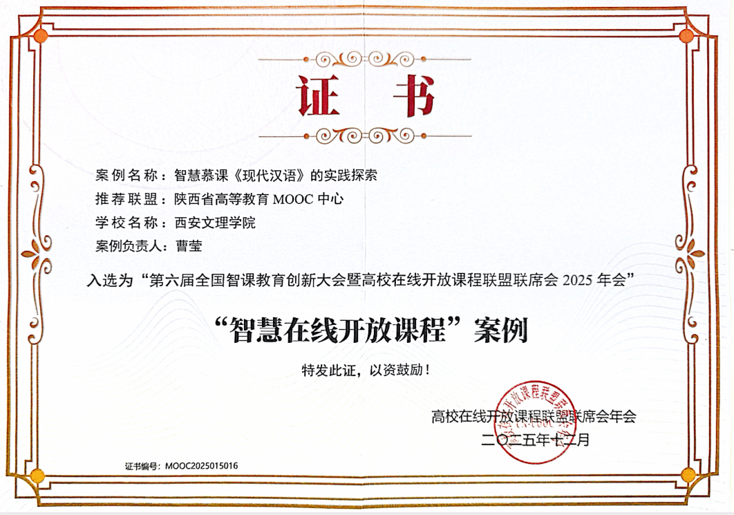 12月13日,第六届全国智课教育创新大会暨高校在线开放课程联盟联席会2025年会在武汉隆重召开,来自全国高校的500余名专家学者围绕"智慧课程引领AI课程建设新范式"进行深入研讨。在这一智慧教育领域的年度盛会上,beats365唯一官方网站曹莹教授主持的《现代汉语》课程入选第六届全国“智慧在线开放课程”优秀案例,该课程为国家一流线上课程,在中国大学慕课网和智慧课树双平台运行,选课高校102所,选课员工累计30146人。本次优秀案例全国共评选出120个,陕西省获评优秀案例20个。