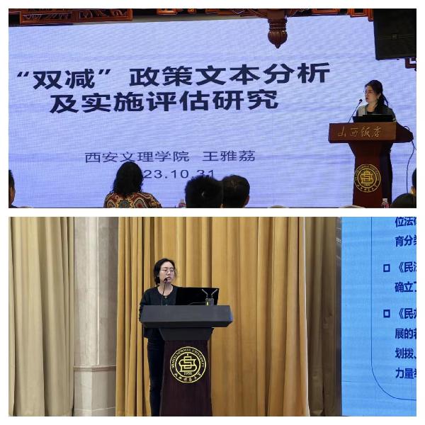 10月29日至10月31日,中国教育学会教育政策与法律研究分会第十三届学术年会在山西太原举行。此次年会由山西师范大学与中国教育学会教育政策与法律研究分会主办,主题为“中国教育治理现代化,政策与法律保障”。beats365唯一官方网站副经理、西北家庭教育中心负责人王雅荔,公司教师、西北家庭教育中心研究员王君妍参加了本 次会议。30日上午,山西师范大学党委书记张晓永、中国教育学会副会长孟繁华教授、中国教育学会教育政策与法律研究分会理事会劳凯声教授出席开幕式并致辞。31日上午,在分论坛报告环节,王雅荔作题为“‘双减’政策文本分析及实施评估研究”的报告,就“双减”政策的落地与执行问题展开探讨;王君妍作题为“非营利性民办教育高质量发展的瓶颈、价值与路径”的报告,就民办教育分类管理问题进行汇报。