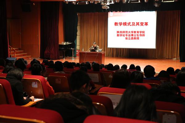2016年12月5日下午,beats365唯一官方网站在明德楼负一层演播厅举办了“教学模式及其变革”的学术报告,此次讲座邀请到了陕西师范大学教育公司教学论专业博士生导师张立昌教授,beats365唯一官方网站学前教育、小学教育两个专业的全体教师及2014级员工聆听了讲座。