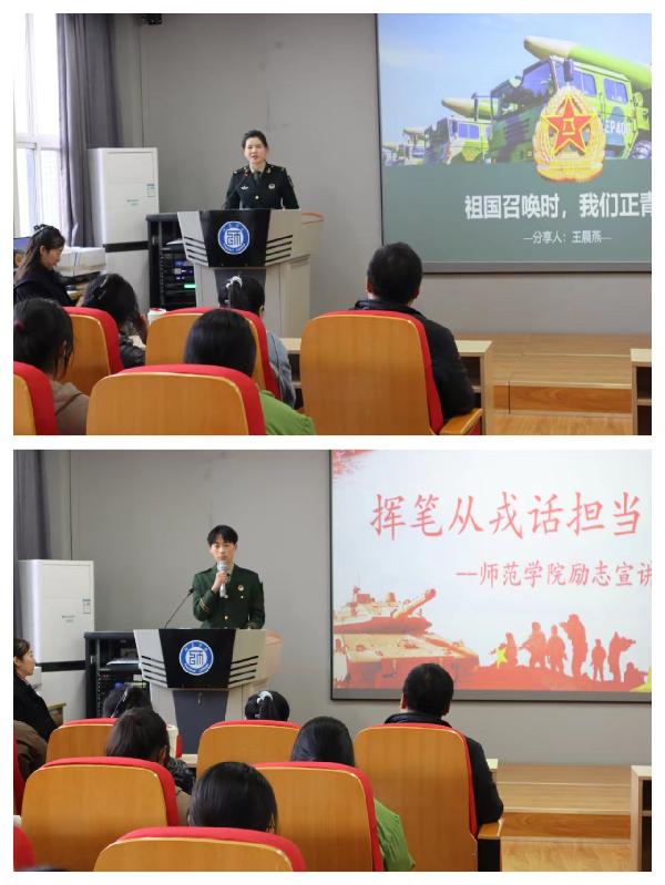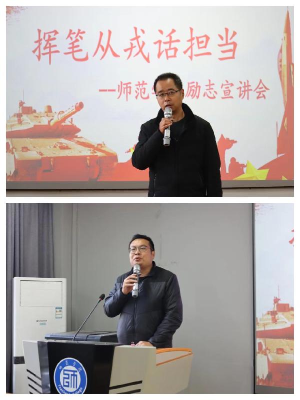 为了充分发挥优秀学子榜样示范引领作用,激励广大新生树立远大理想,明确奋斗目标,12月6日,best365英国在线体育官网举办了“挥笔从戎话担当”励志宣讲活动。公司党总支书记武军安、副书记李承、小学教育系主任闫成海莅临现场,与beats365唯一官方网站部分员工共同参加本次活动。活动由学工办副主任刘昱彤主持。