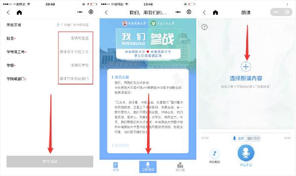 朗读者参与活动详细操作步骤:1、点击机构的公众号菜单栏,或扫描活动举办方提供的活动二维码,进入活动详情页;2、点击【参与活动】后,如您是第一次使用小程序,系统将会请求使用您的手机号码、头像、昵称、地区的,请一定要点击【允许】,否则无法参加活动。3、填写报名信息和录制作品①填写真实的个人信息;②点击下方的【立即朗读】,进入录制作品;③如活动指定了朗读内容,则跳转到指定素材列表;④如活动未指定素材,朗读者请点击+号,进入“文库”中选择素材,也可以自己上传素材进行朗读;⑤在录制作品时,可选择合适的配乐,并通过手机音量键调节配乐声大小,让录制效果更好。