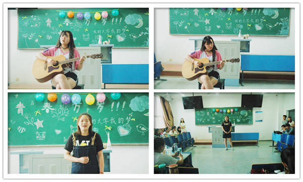 三个班级分别围绕“青春”、“未来”、“梦想”的主题展开了形式多样的活动,同学们全员参加,精心准备节目,独具特色的舞蹈、优雅的钢琴演奏、书法和绘画的展示、美妙动听的歌曲、幽默风趣的小品以及耳目一新的魔术都令在场师生目不暇接,游戏环节的设置也非常有趣,老师们和同学们一起玩“夹气球”、“向左看向右看”等,调动着师生参与的热情,互动环节还有给十年后自己的一封信,或者是通过图片回顾大学两年来的学习、生活的点滴,这些环节的设置都让同学们在交流互动游戏的平台中体会着“拥抱青春、守护梦想、携手未来”的主题。