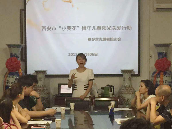 会议上共青团西安市教育局团委书记李晓燕向与会人员介绍了“小葵花”系列活动:“小葵花”活动旨在以实际行动贯彻落实十八大精神,给城市员工和幼儿提供锻炼能力、培养爱心的平台,帮助品学兼优、家庭贫困的农村儿童主要是留守儿童开阔眼界,立志成才,进一步号召全社会关爱农民工及其子女,在我市弘扬扶困济弱的公益精神,为创建文明城市工作作出贡献。会议上回顾了“小葵花”爱心活动前三期的进展情况;播放了2014年度“小葵花”活动的回顾视频;介绍了本次“小葵花”暑期爱心夏令营的活动安排以及志愿者的工作要求与任务。