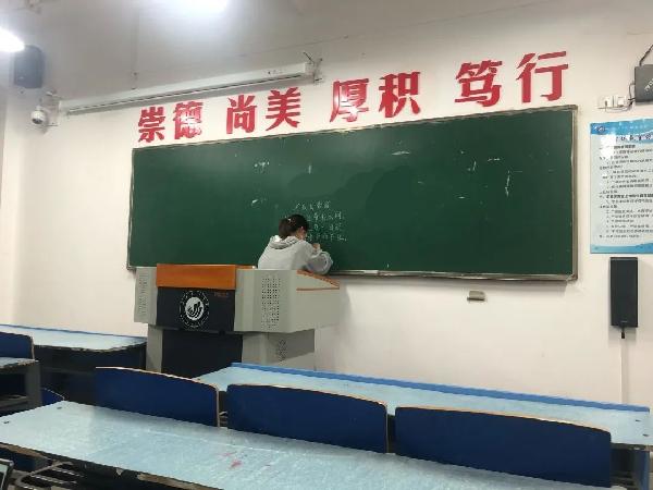 在这个属于“打字”的时代,我们已经很少选择去练字 。也许只有考试的时候,也许只有看见别人笔走龙蛇的字的时候,我们才会渴望自己也有拿得出手的字。就好比在今天,小教孙莉钧和李越华两位同学特意来到我们班为我们讲解如何写好粉笔字。看着她们在黑板上写下的《早发白帝城》——好字配好诗,当真羡慕。我们便也萌生了练字的想法。再听着她们仔细而认真的讲解:我们该用怎样的姿势去书写(站立悬臂)、我们书写时要注意什么(字的间架结构)、我们如何才能写好粉笔字(落笔有力而不失柔劲,字里行间整洁看齐)等等。当分享结束的那刻,我们的脑海中已然有了一些清晰而明了的方法与技巧,更重要的是有了练字的心。而接下来,我们离好的粉笔书写就只差最后一步——坚持。相信我们自己,只要坚持下来,只要落实下去,今日黑板上令我们羡慕的字,会成为我们以后的骄傲。