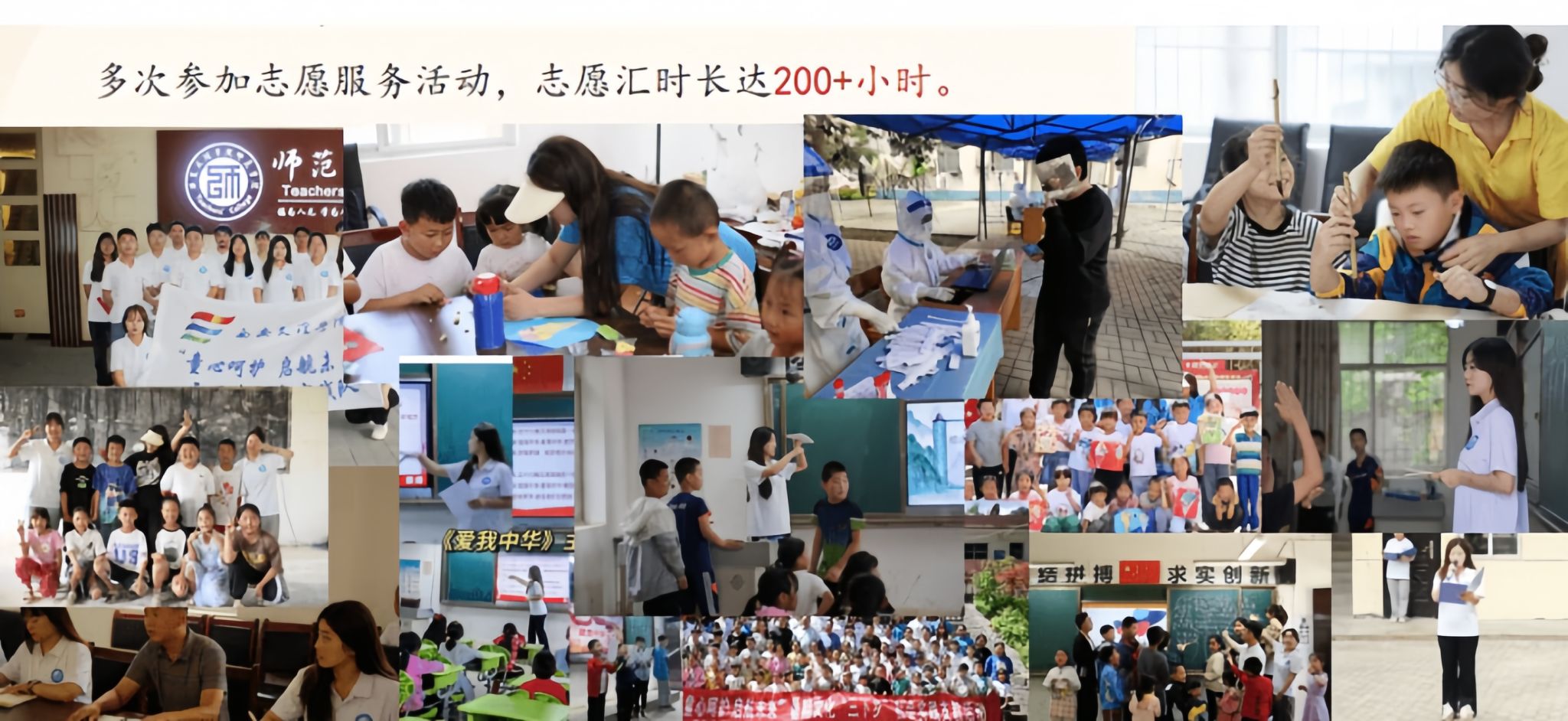 秉持知行合一的原则,她积极投身于志愿服务以及社会实践当中,在暑期期间,她两次参与到蓝田县厚镇宋寨村的三下乡社会实践中,陪伴孩子们度过属于他们的暑期夏令营;多次参与到西安市数学经济学会的志愿服务中,做场务,电脑操作员和登报记者等。除此之外,还有陕西省三秦教育论坛、毕业生论文答辩、招生宣传、卫生劳动等,志愿时长累计达200小时。