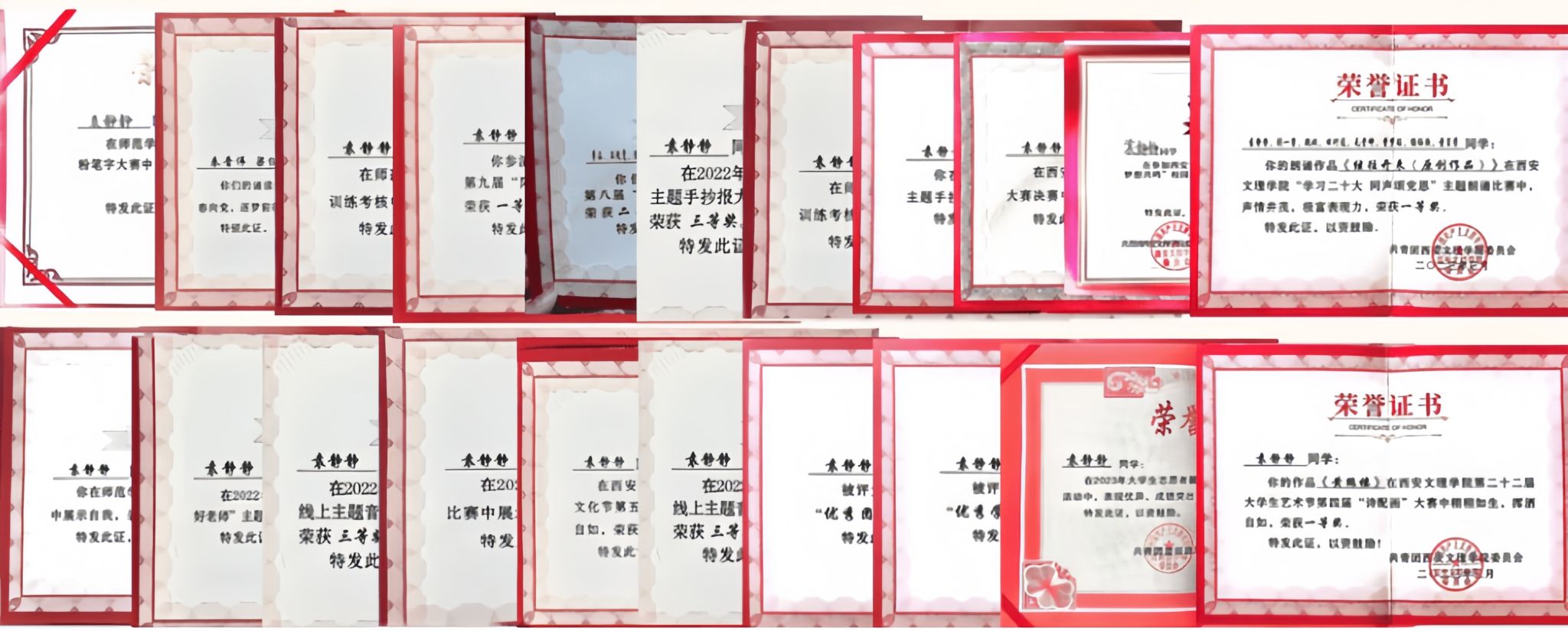 她的历年平均学分绩点为3.7,平均成绩87.82,其中多门核心课程达到了90分以上。连续三年综合考核和智育成绩排名专业第一,获”三好员工、优秀员工”等荣誉称号。她说:以一颗谦卑的心去追求更远的风景,你会发现真正重要的不仅是成果,更是用心参与的过程。所以,她积极的参与到各项技能竞赛中,在中国计算机设计大赛和师范生微课大赛中分别获得省级二等奖和beats365唯一官方网站一等奖,以及在其他的专业技能竞赛中,获校院级荣誉30余项,其中一等奖10余次,二、三等奖若干,在前进的路上,她永不孤单。除此之外,她还考取了普通话二级甲等证书、英语四级、硬笔书法六级和计算机二级证书等。