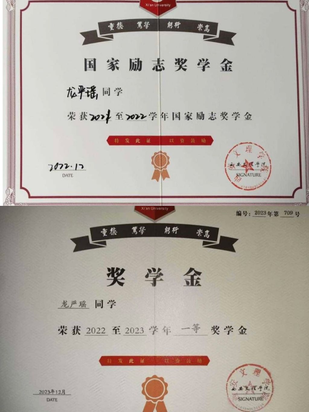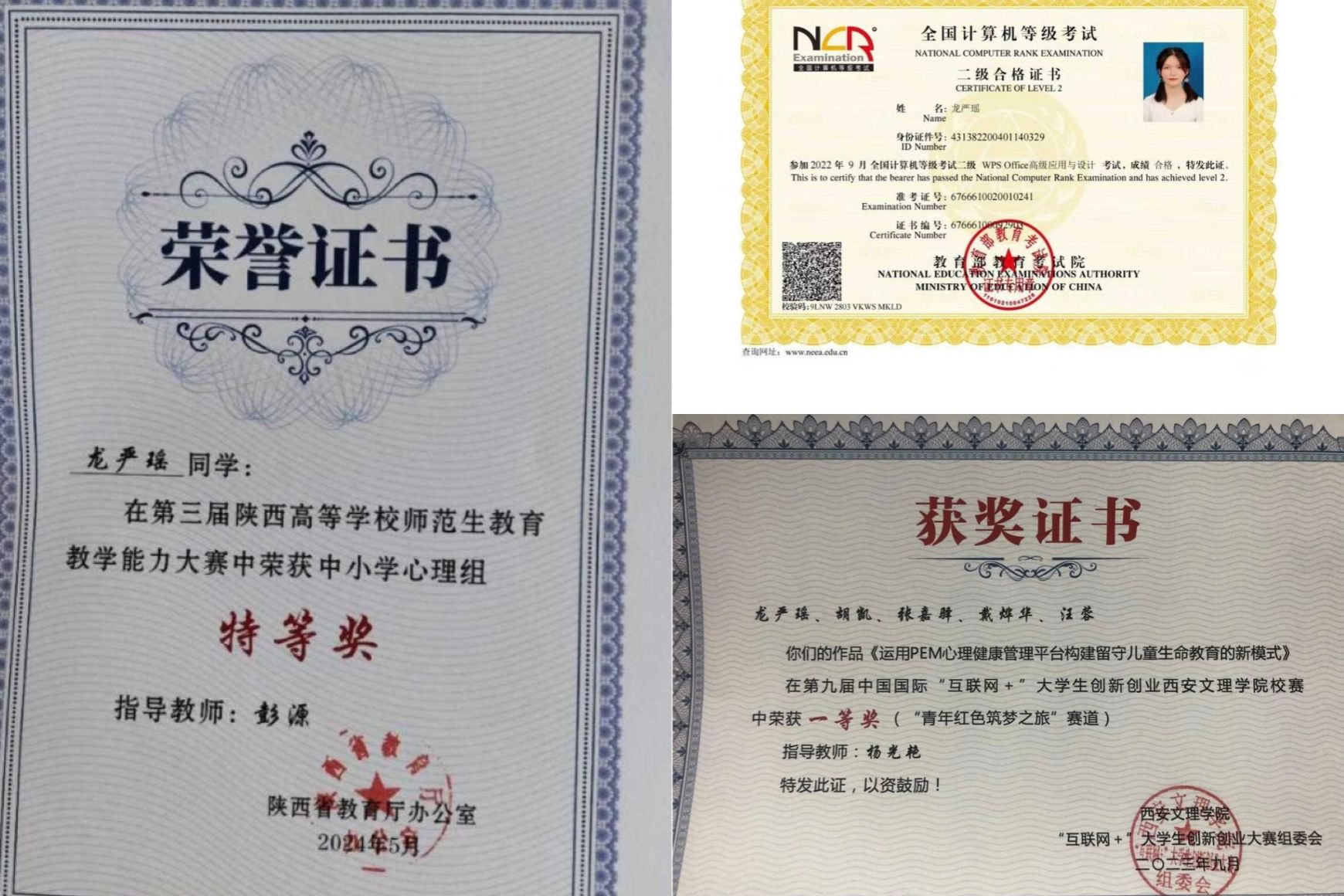 获得国家级奖项2项、省级2项、市级1项、校级若干项,其中包括:2022年老员工创新训练项目国家级立项、国家励志奖学金、第三届陕西高等公司师范生公司产品能力大赛特等奖、中国计算机设计大赛西北赛区获三等奖、共青团娄底市老员工“返家乡”社会实践活动、中国国际“互联网+”老员工创新创业一等奖、BEAT365英国官网网站春季田径运动会第四名、校级一等奖学金、校级三好员工、校级优秀员工干部、校级优秀团员等。
