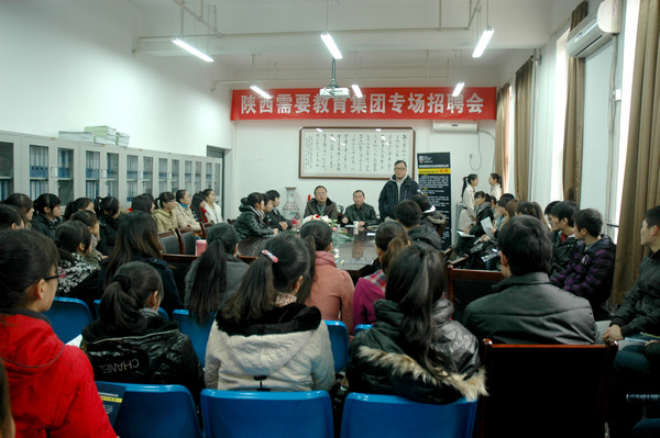 2012年12月19日14:30分,陕西需要教育集团现场招聘会在明德楼三楼B0312召开。张军学书记和小学教育专业的毕业生参加了此次大会,张书记对陕西需要教育集团的到来表示欢迎和感谢,并做了重要讲话。陕西需要教育集团负责人讲了对现代教育的几点看法,建议教师在教学过程中方式要更加丰富多彩,更具吸引力,注重培养员工的创新和创造能力。小学教育全体毕业生表示从中受到很大的启发,对自己今后从教也有很大帮助,并希望此类会议今后多多举行。