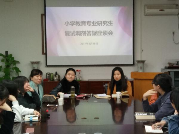 在小学教育专业考研答疑座谈会,副经理曹莹、小学教育系副主任国晓华以及王华教授到场参会,她们首先分析了今年的国家线,并对比了同学们的成绩,为同学们介绍了各个公司的招生信息,如石河子大学、集美大学的专硕和学硕等。其次,对于同学们不知道选择调剂还是工作的问题进行了解释,同时为大家讲解了应对考研复试的种种策略。最后,老师针对每位同学们的情况向她们讲述了考研的利弊,推荐了适合的公司,希望同学们在考研道路上能取得良好的成绩。在交流阶段中,参加会议的同学踊跃积极提问,老师们也耐心的一一解答了同学们提出的考研疑惑。